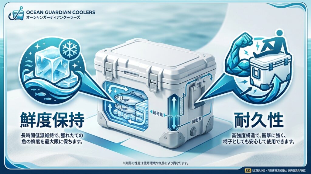 その分、重量感はありますが、大人が座ってもびくともしない堅牢なボディはハードな使用環境に最適です。「せっかくの遠征で釣った魚を、帰宅するその瞬間まで最高の鮮度で維持したい」という、食味への妥協を許さないアングラーにとって、このクーラーボックスは唯一無二の選択肢となるでしょう。