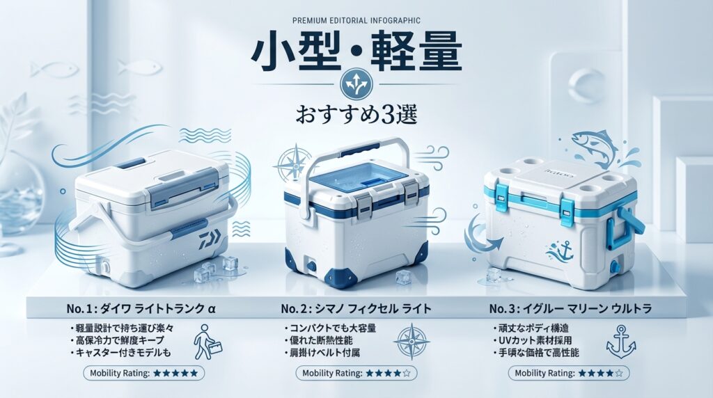 ここでは、過剰な容量や機能を削ぎ落とし、持ち運びやすさと必要十分な保冷力を両立した、機動力特化型のモデルを厳選しました。身軽さを武器に、より多くのポイントを攻略したいアングラーに最適な選択肢です。