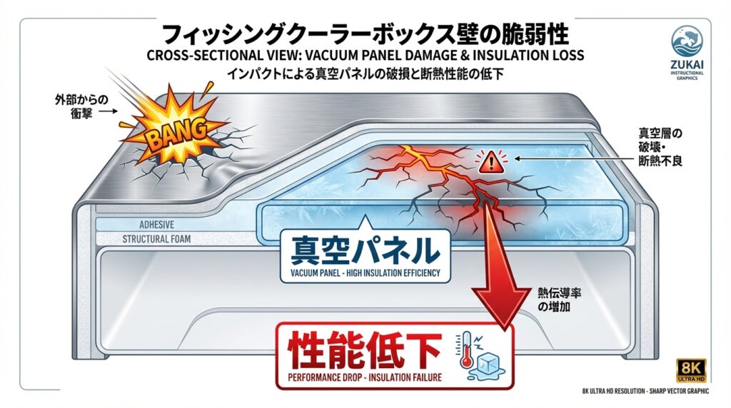 真空断熱パネルは、内部を真空状態にすることで熱の伝わりを遮断する、いわば「魔法瓶」のような構造をしています。そのため、落下させたり、尖った岩場に激しく打ち付けたりしてパネル自体に破損や変形が生じると、そこから空気が入り込んで真空状態が解除されてしまいます。こうなると断熱材としての効果は失われ、元に戻すことはできません。