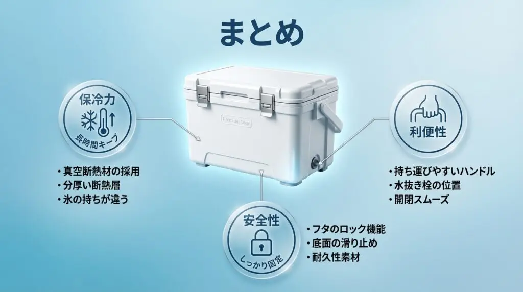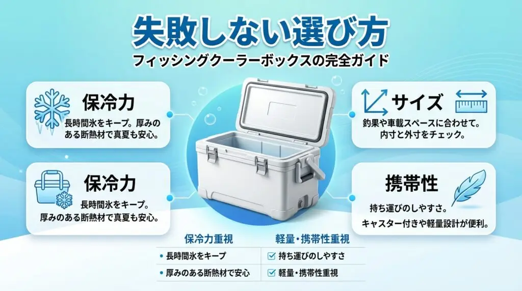 結論から言うと、迷ったら「ダイワまたはシマノの真空パネル搭載モデル」を選ぶのが、保冷力と機能性のバランスにおいて最も後悔しない選択です。それでは、失敗しない選び方から見ていきましょう。