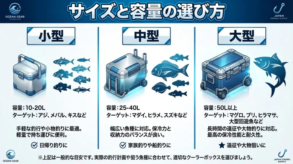 クーラーボックスを選ぶ際、多くの人が真っ先に確認するのが「容量(リットル数)」です。しかし、釣り用として選ぶ場合に容量以上に重要なのが「内寸」、特に「長辺の長さ」です。
