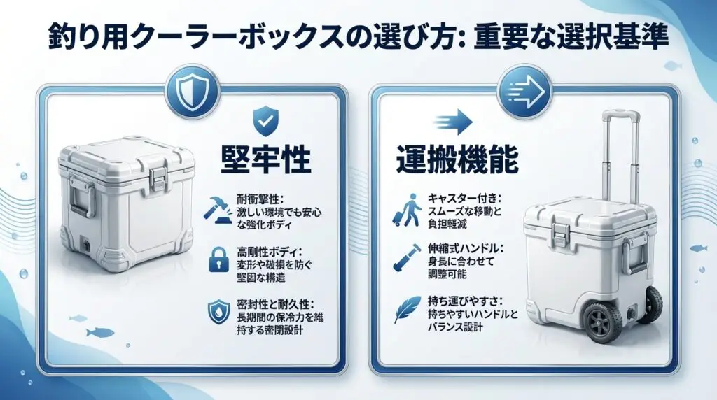 クーラーボックス選びにおいて、保冷力や容量と同じくらい重要なのが、現場での実用性を決める「堅牢性」と「運搬機能」です。カタログスペック上の数値だけを見て購入し、実際の釣り場で「使いにくい」と後悔するケースの多くが、この2点に集約されます。