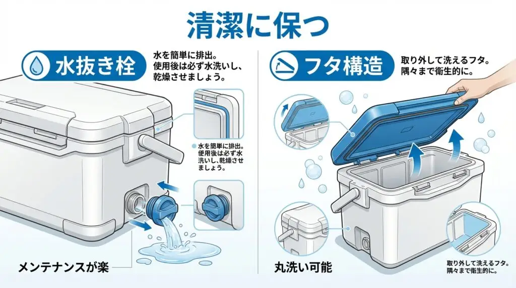 釣行後の疲れた体で行う道具の手入れは、誰にとっても億劫な作業です。しかし、魚のヌメリや血がクーラーボックス内部に残ると、強烈な悪臭の原因となるだけでなく、次回以降に入れる食材の衛生状態も脅かしかねません。そこで重要になるのが、洗いやすさに直結する「水抜き栓(ドレン)」と「フタの構造」です。
