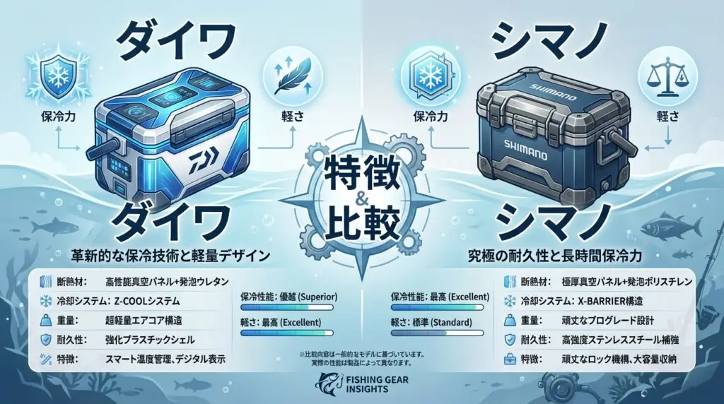 まず決定的に異なるのが、カタログスペックに対する誠実さです。一般的なクーラーボックスの保冷力表示はJIS規格などが用いられますが、ダイワとシマノはそれに加え、独自の実用的な保冷基準(KEEP値、I-CE値)を設定しています。これにより、「氷が何時間持つか」という釣り人にとって最も切実な問いに対し、嘘偽りのない性能を提示しているのです。