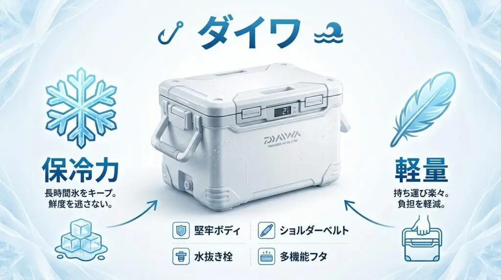 釣り具の二大メーカーの一角であるダイワ(グローブライド)のクーラーボックスは、全体的に「軽さ」と「使い勝手」を重視した設計思想が貫かれています。同じ容量クラスで比較した場合、ダイワ製品は他社よりも軽量に作られている傾向があり、駐車場から釣り場まで距離がある場合や、荷物が多くなりがちなファミリーフィッシングにおいて、その機動力は大きなアドバンテージとなります。