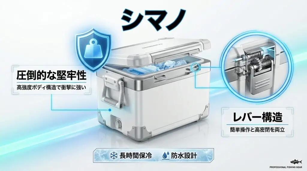 一方、シマノは「堅牢性と耐久性」を最優先する傾向があり、大人が座ってもびくともしない頑丈なボディや、密閉力を極限まで高めるレバー構造が特徴で、磯や船などハードな環境で使う方に選ばれています。