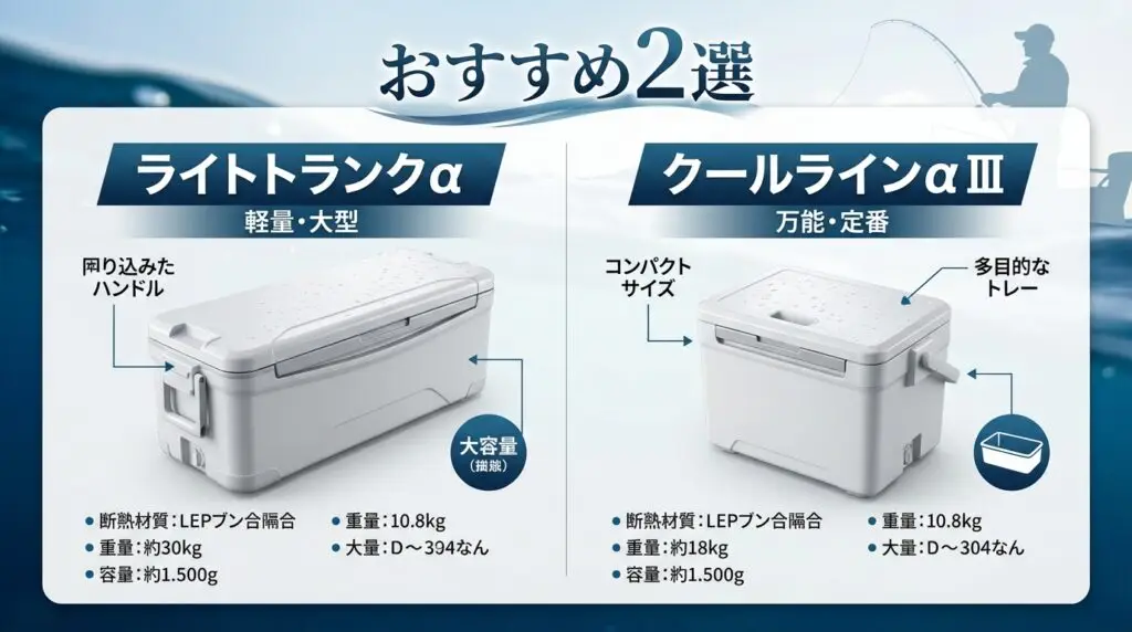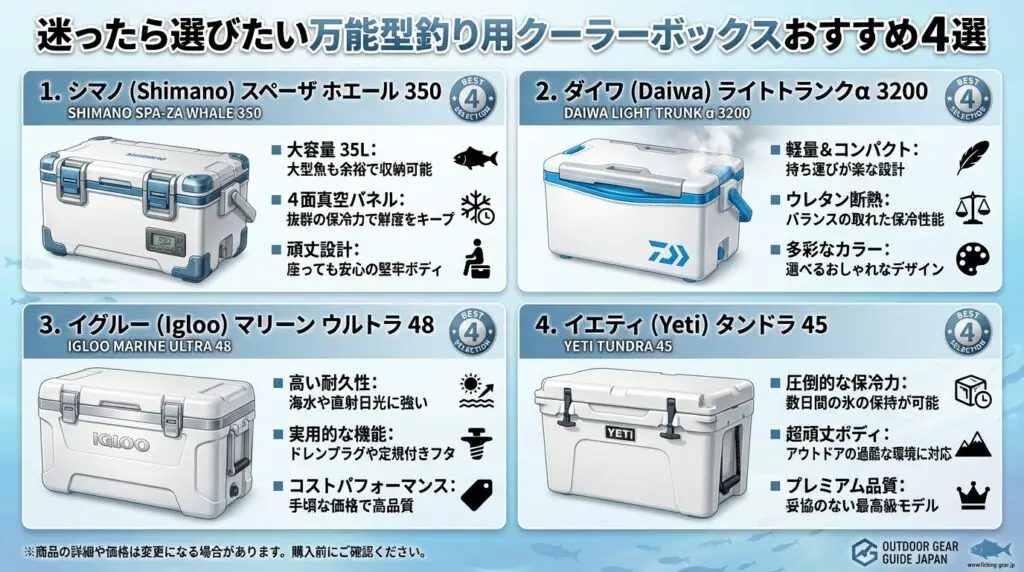 数ある釣り用クーラーボックスの中でも、どれを選べば良いか迷った際に「これを選んでおけば間違いない」と断言できる、バランスの取れた万能モデルを厳選しました。