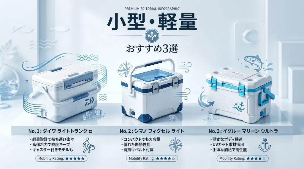 ここでは、過剰な容量や機能を削ぎ落とし、持ち運びやすさと必要十分な保冷力を両立した、機動力特化型のモデルを厳選しました。身軽さを武器に、より多くのポイントを攻略したいアングラーに最適な選択肢です。