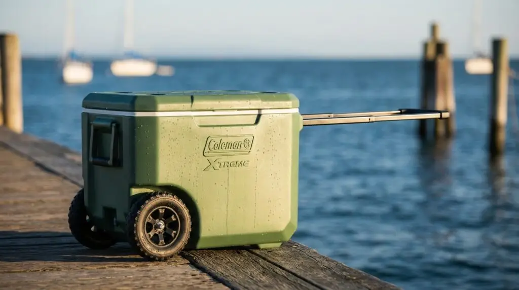 アウトドアブランドの雄であるコールマンの製品ですが、実は堤防釣りなどの現場で非常に高い使用率を誇る一台です。その最大の理由は、悪路走破性に優れた大型ホイールとキャリーハンドルによる圧倒的な「運搬性能」にあります。