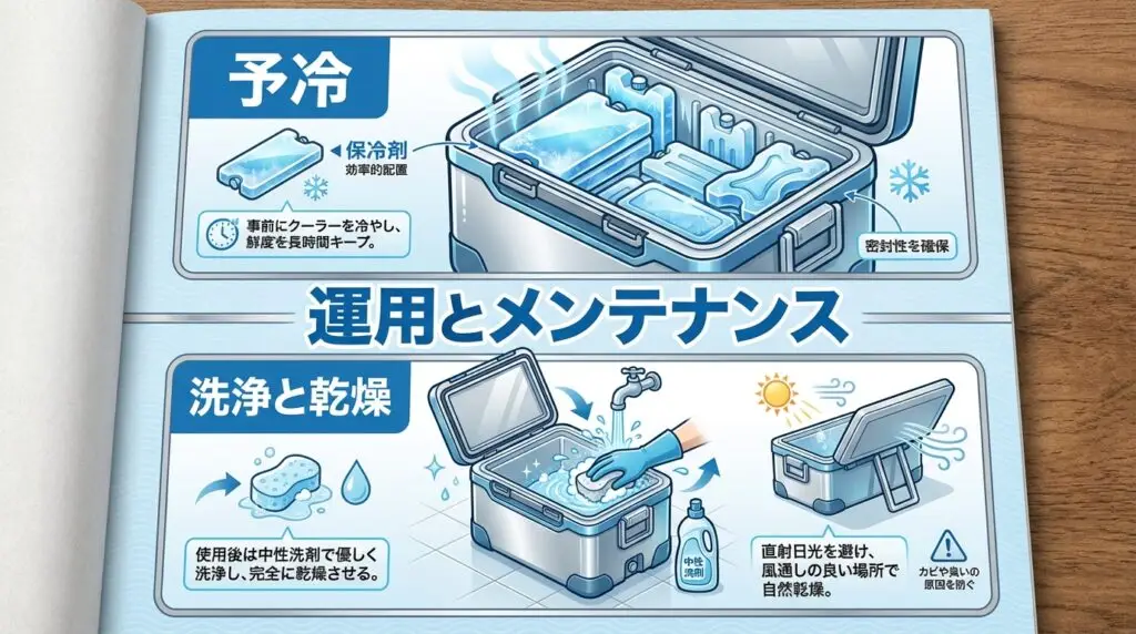 スペック以上の性能を引き出し、大切な獲物を最高の鮮度で持ち帰るためには、物理法則に基づいた「運用のコツ」が存在します。ここでは、ベテランアングラーが実践している保冷テクニックと、愛用品を長く使い続けるためのメンテナンス術について解説します。