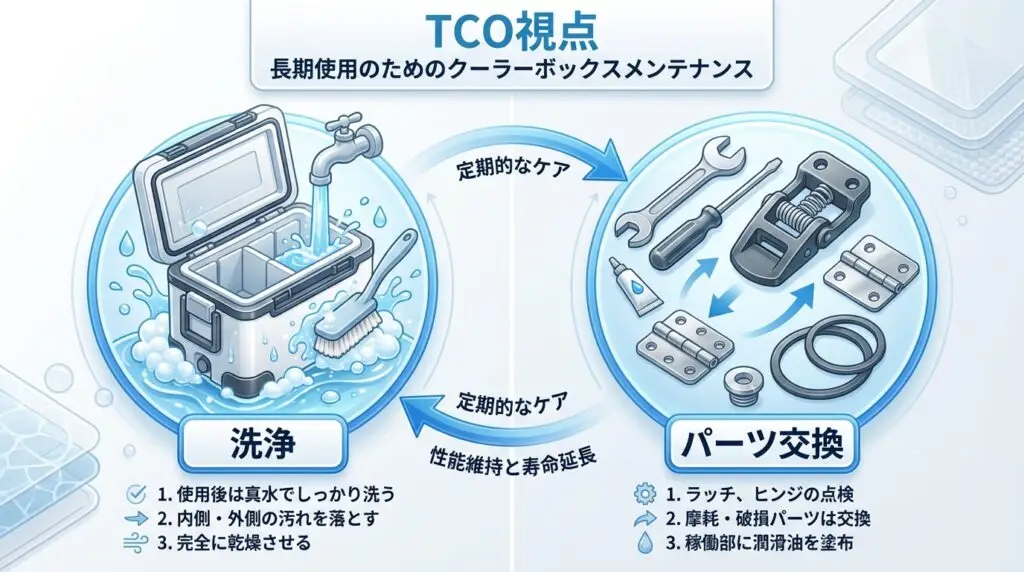 また、長期的なコストパフォーマンス(TCO)を考える上で重要なのが「消耗パーツの交換」です。どれほど高価なクーラーボックスでも、ゴムパッキンやプラスチック製の留め具、滑り止めのゴム足などは経年劣化を避けられません。パッキンが弾力を失うと密閉性が下がり、購入当初の保冷力を発揮できなくなってしまいます。