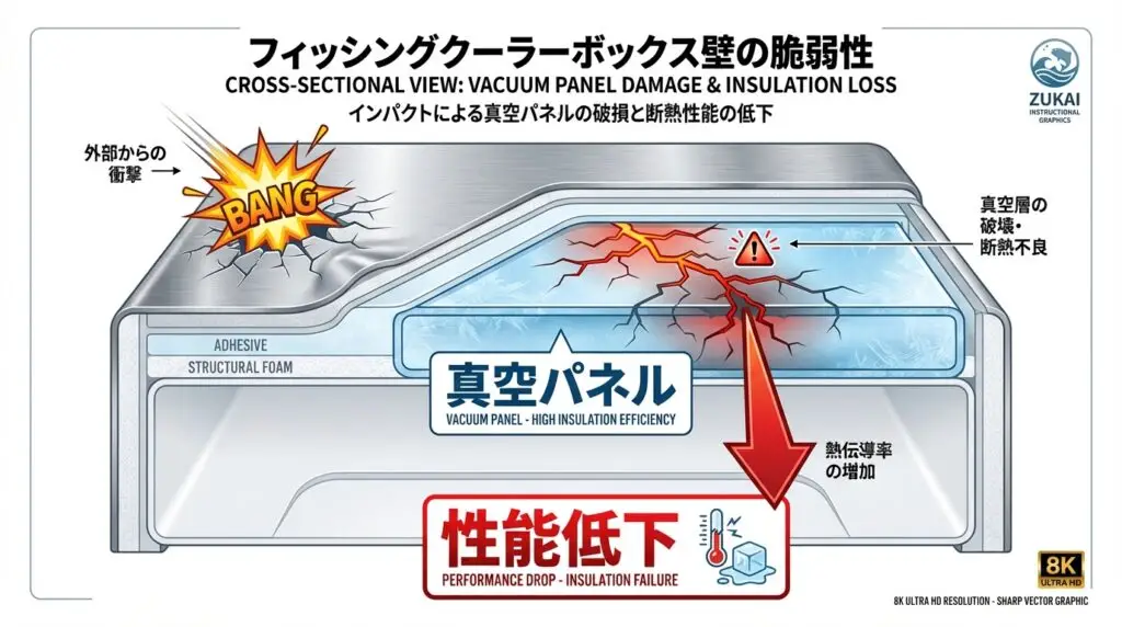 真空断熱パネルは、内部を真空状態にすることで熱の伝わりを遮断する、いわば「魔法瓶」のような構造をしています。そのため、落下させたり、尖った岩場に激しく打ち付けたりしてパネル自体に破損や変形が生じると、そこから空気が入り込んで真空状態が解除されてしまいます。こうなると断熱材としての効果は失われ、元に戻すことはできません。