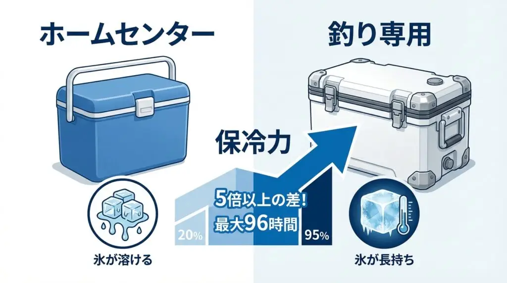 決して「使えない」わけではありませんが、釣り専用クーラーボックスとは「設計思想」が根本的に異なります。ホームセンターで販売されている数千円程度の安価なクーラーは、主にキャンプやBBQでの「数時間の保冷」を想定して作られています。そのため、断熱材には密度の低い発泡スチロールが使われていることが多く、フタの密閉性(パッキンの性能)も簡易的です。