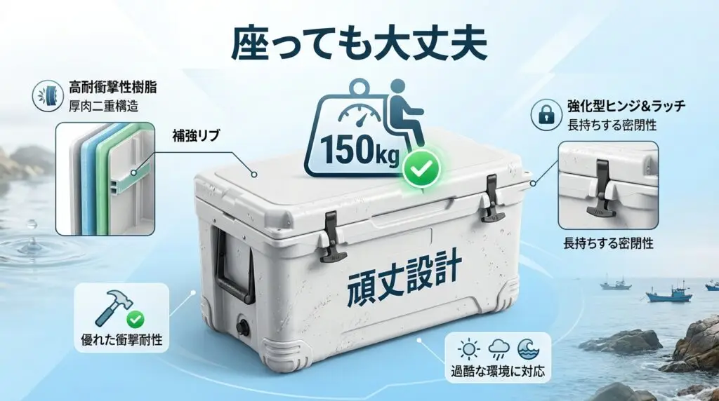 まず「堅牢性」ですが、端的に言えば「大人が座れるかどうか」が大きな判断基準となります。防波堤や船上では、長時間立ちっぱなしで釣りをすることは稀で、アタリを待つ時間は座って過ごすことが多くなります。この時、クーラーボックス自体を椅子として使えれば、別途折りたたみ椅子を持ち運ぶ必要がなくなり、荷物を劇的に減らすことができます。