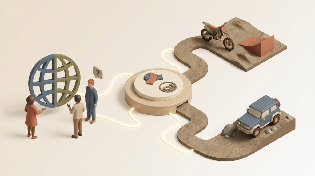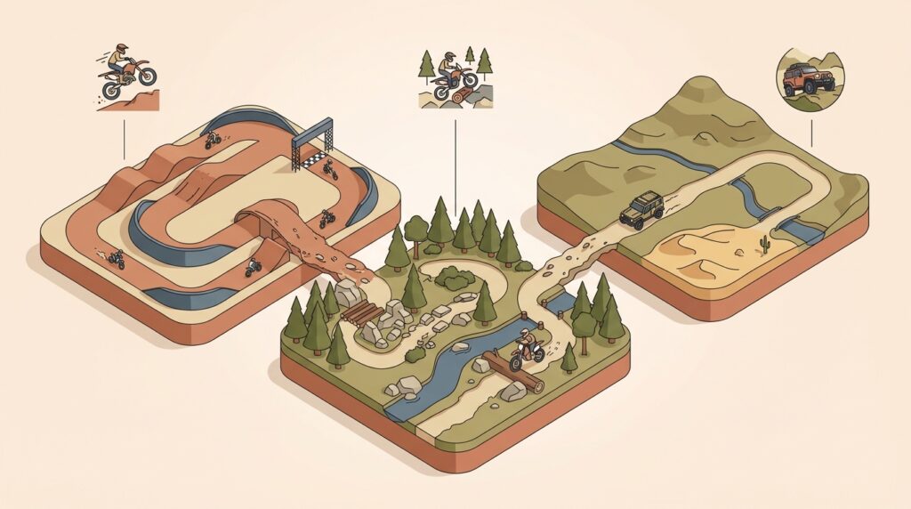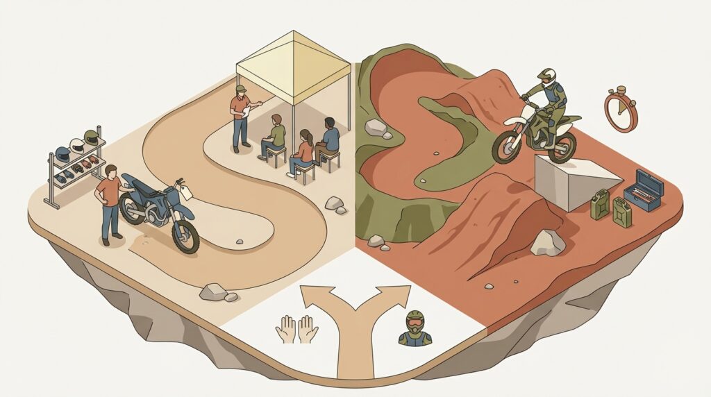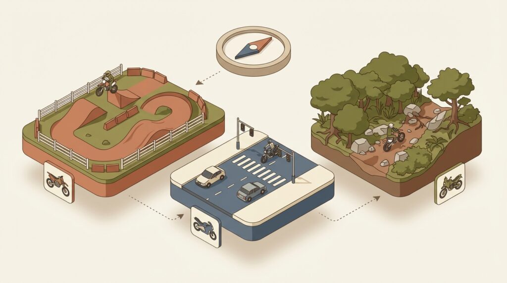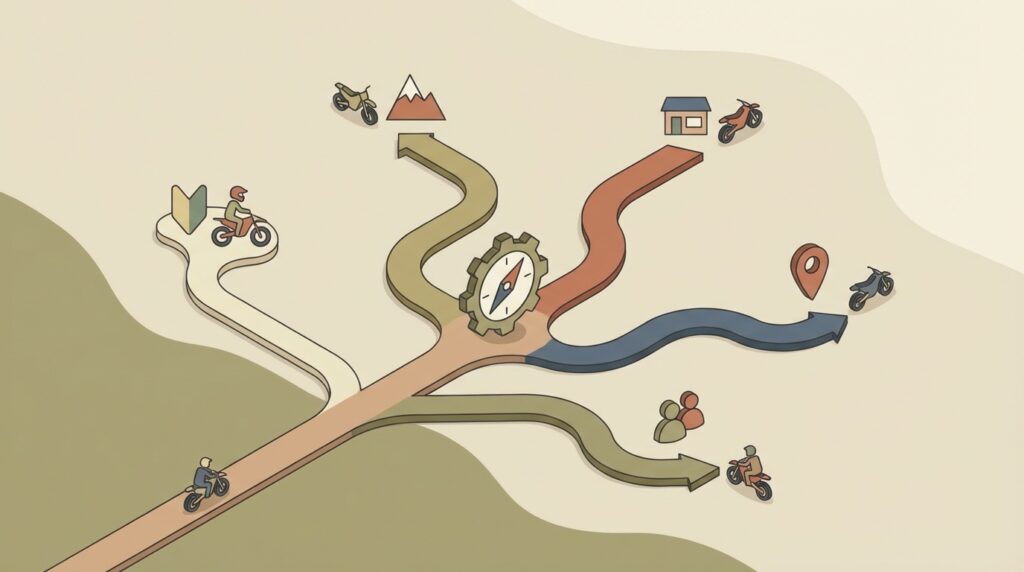 オフロードコースを選ぶ上で最も大切なのは、「オフロードバイクで何をしたいのか」という目的をはっきりさせることです。なぜなら、その目的によって、最適なコースのタイプや必要な準備が全く異なってくるからです。
