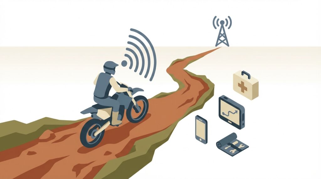 最も警戒すべきリスクは、転倒による怪我やマシントラブルで動けなくなった際に、助けを呼ぶのが困難になることです。特に、コースから外れた場所や人の目につきにくい林間セクションで転倒した場合、発見が遅れてしまう危険性があります。また、ぬかるみでバイクが動かせなくなる「スタック」はオフロードでは日常茶飯事ですが、一人で重いバイクを引き上げるのは非常に困難で、体力を著しく消耗してしまうでしょう。