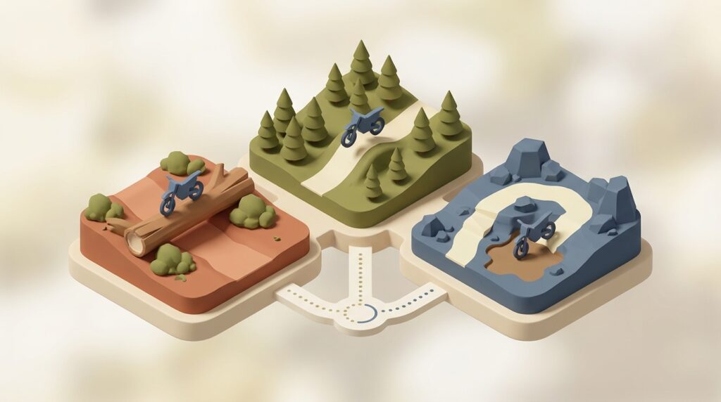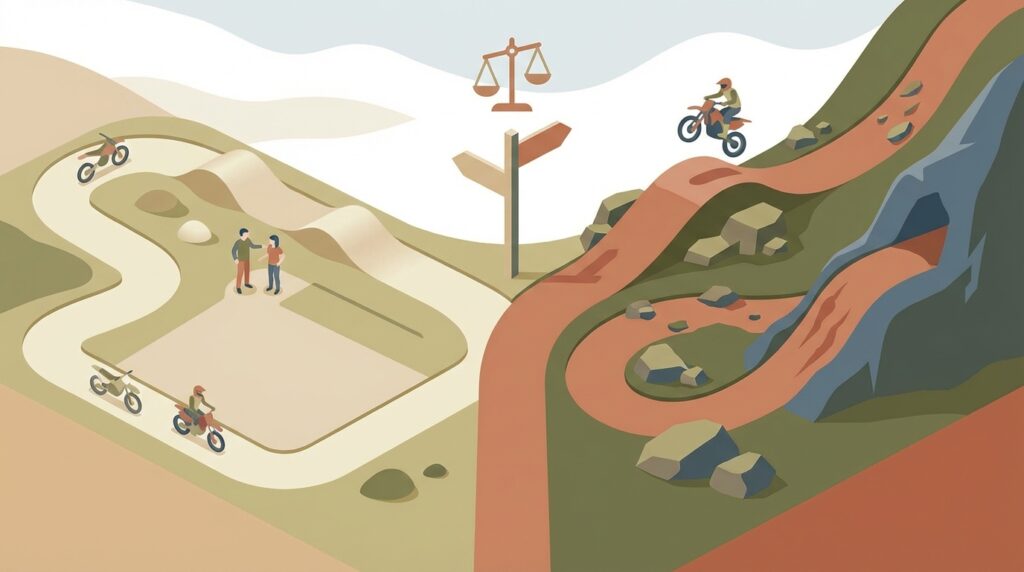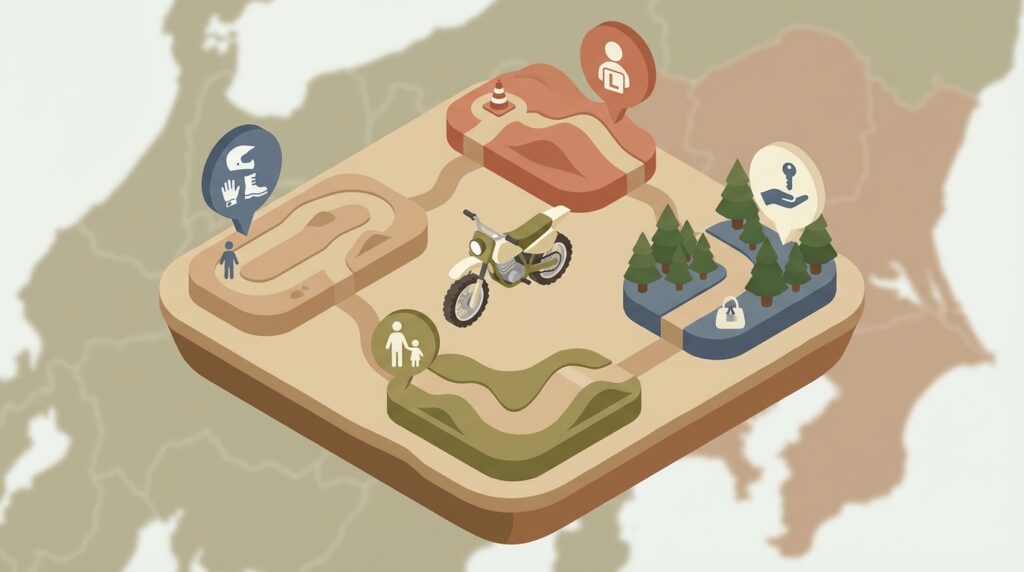 自分のライディングレベルを客観的に判断することも、コース選びで失敗しないための重要なポイントです。オフロードコースには、初心者向けから全日本選手権が開催されるような上級者向けまで、様々な難易度のコースが存在します。もしレベルに合わないコースを選んでしまうと、全く楽しめないばかりか、思わぬ怪我に繋がる危険性もあるでしょう。