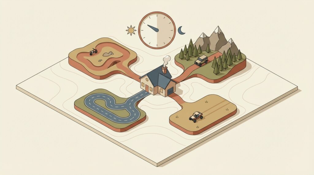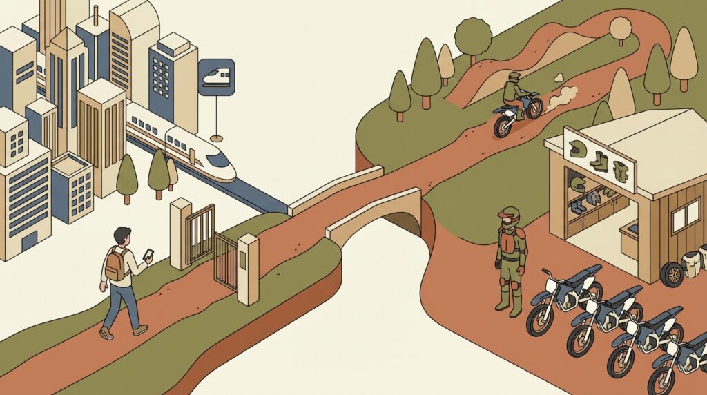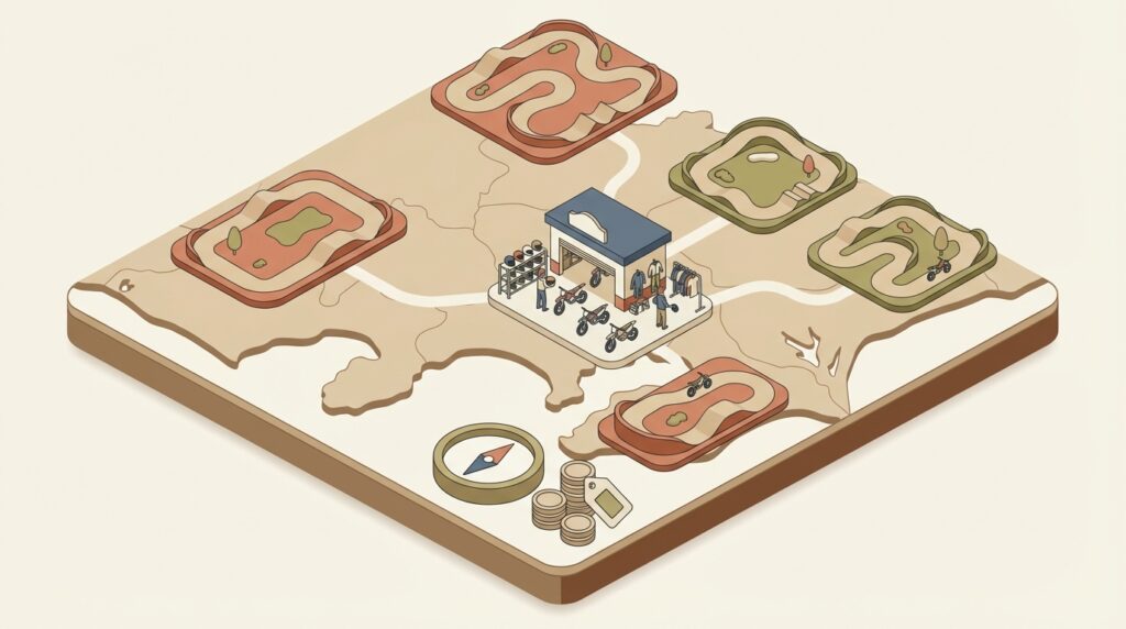 オフロードコース選びでは、コース内容だけでなく自宅からのアクセスも非常に重要な判断基準となります。なぜなら、オフロード走行は想像以上に体力を消耗するため、移動に時間をかけすぎると、肝心の走行を楽しむ体力が残っていなかったり、疲労困憊のまま長距離を運転して帰宅することになったりするからです。