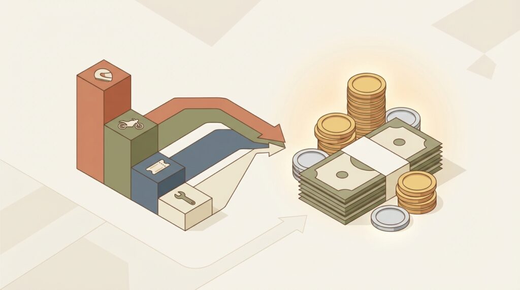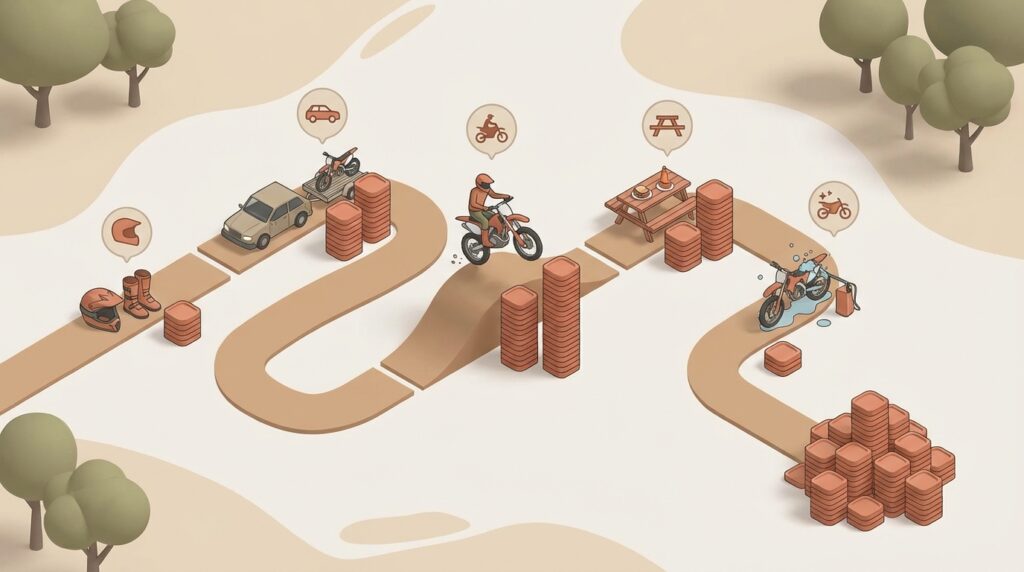 オフロードコースで一日を楽しむためには、走行料以外にもいくつかの費用がかかることを念頭に置いておく必要があります。多くの初心者が「走行料だけ払えば良い」と考えがちですが、現地で思わぬ出費に慌てないためにも、トータルの予算感を把握しておくことが重要です。