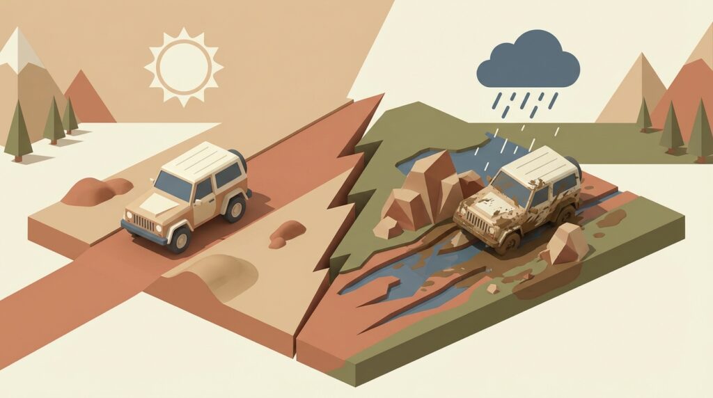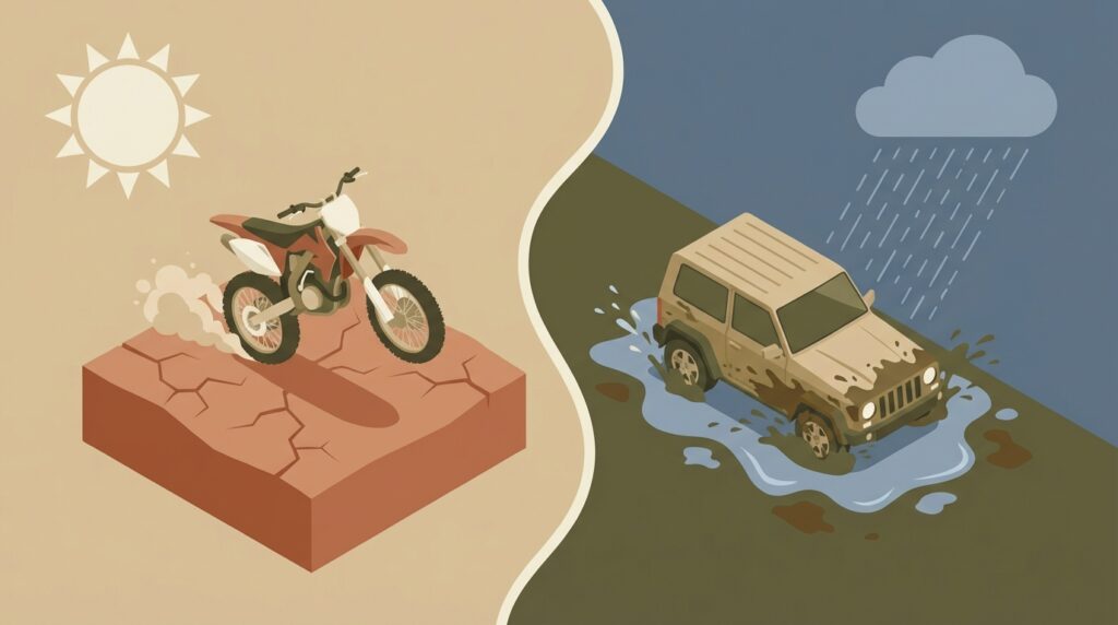 多くのコースは「初心者歓迎」と謳っていますが、その言葉を鵜呑みにするのは危険かもしれません。なぜなら、オフロードコースの難易度は、天候によってプロでも苦戦するレベルにまで激変することがあるからです。