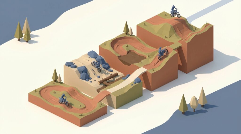 全くの未経験者であれば、広場での練習や、インストラクターが常駐するスクールがある施設が安心です。緩やかなアップダウンで構成されたミニコースや、8の字練習などができるスペースが確保されている場所を選びましょう。一方で、ある程度の経験を積んだ中級者以上であれば、より挑戦的なジャンプ台やタイトなコーナー、自然の地形を活かしたエンデューロコースなどがスキルアップに繋がります。