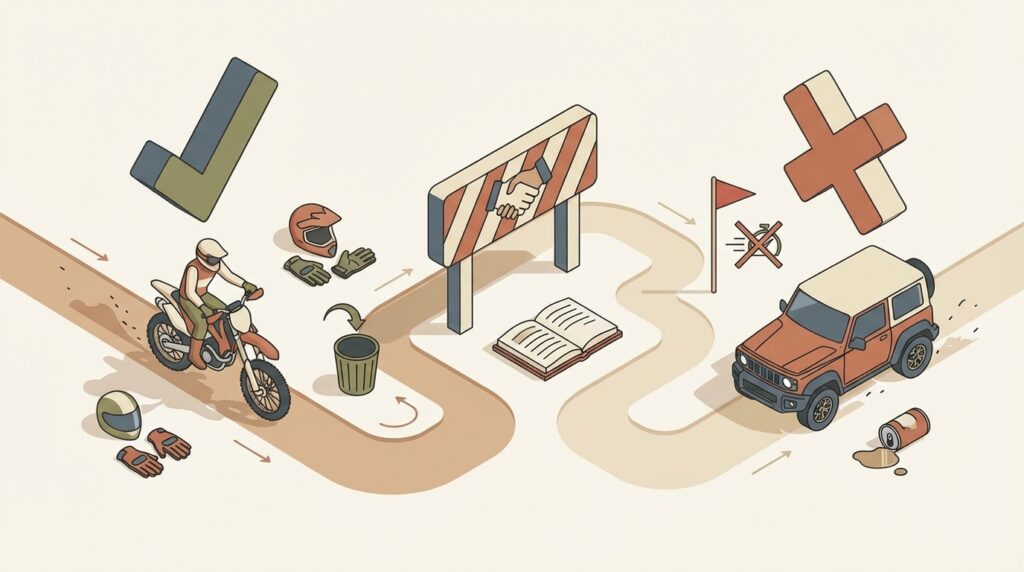 その他にも、コース内での逆走やショートカットをしない、ピットや休憩エリアではエンジンをこまめに切って騒音に配慮する、ゴミは必ず持ち帰るといった基本的なルールがあります。誰もが安全で気持ちよく一日を過ごせるよう、自分本位な行動は慎まなければなりません。これらのマナーを守ることは、オフロードという素晴らしい趣味を未来にわたって楽しむための、ライダー一人ひとりの大切な責任と言えるでしょう。