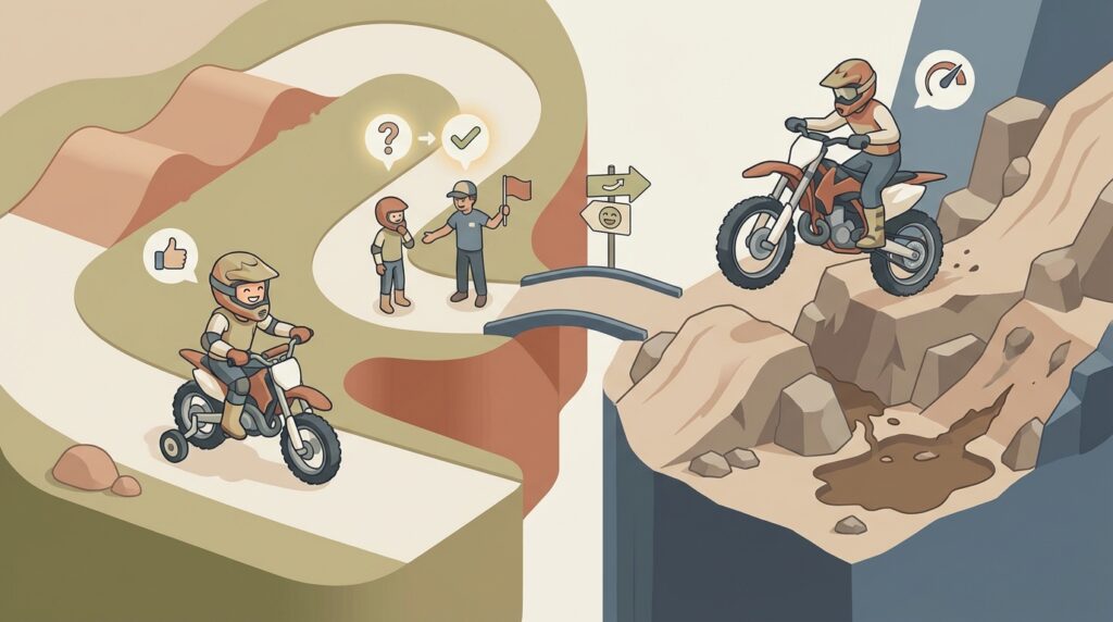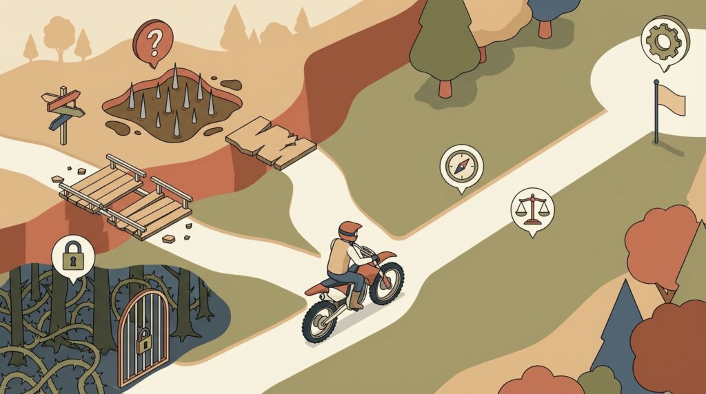 楽しいはずのオフロードデビューが、思わぬ落とし穴で残念な思い出にならないために。ここでは、多くの初心者が経験しがちなコース選びの「罠」と、安全に楽しむための注意点を解説します。事前に知っておくだけで、当日の安心感が大きく変わるでしょう。