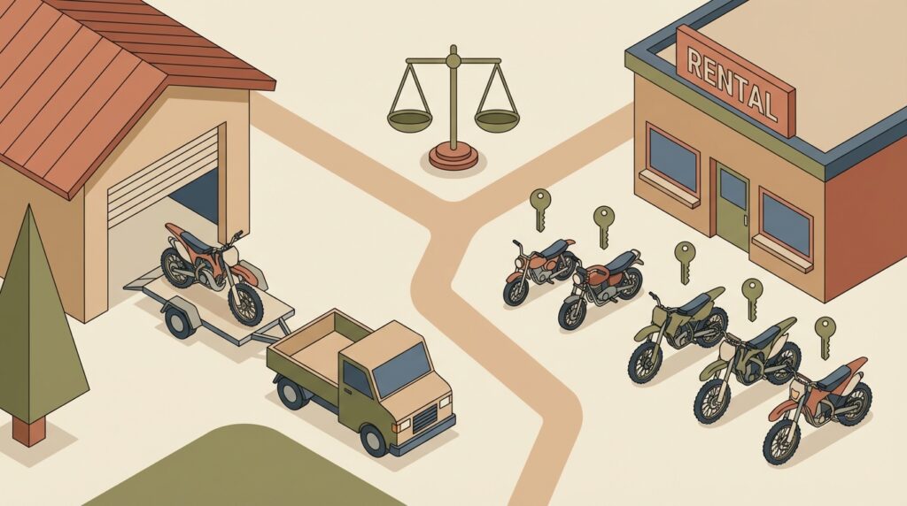オフロードコースを走る上で、バイクを自分で持ち込むか、現地でレンタルするかは大きな選択肢です。それぞれにメリットとデメリットがあるため、ご自身の状況に合わせて最適な方法を選びましょう。