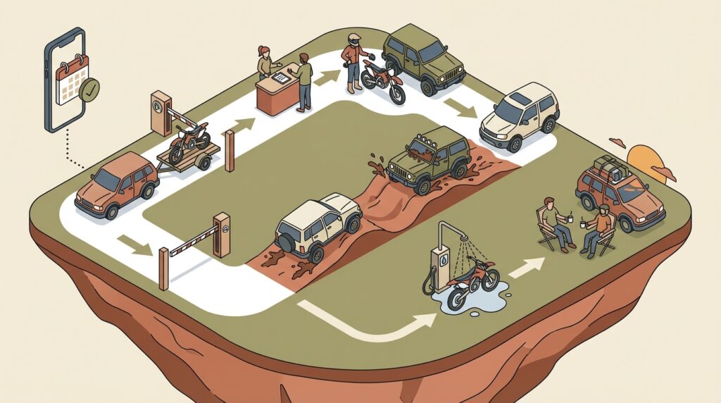 このタイムスケジュールを基準に、コースの所在地を確認し、無理なく移動できる範囲の施設を選ぶようにしてください。特に一般道を使う場合は、週末の渋滞なども考慮に入れて、余裕を持った計画を立てることが、オフロードの1日を最高に楽しむための鍵となります。